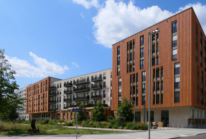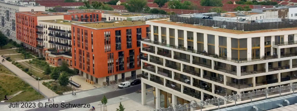 Reste des zerstörten Hauptpostgebäudes wurden in die neuen Wohnhäuser einbezogen.