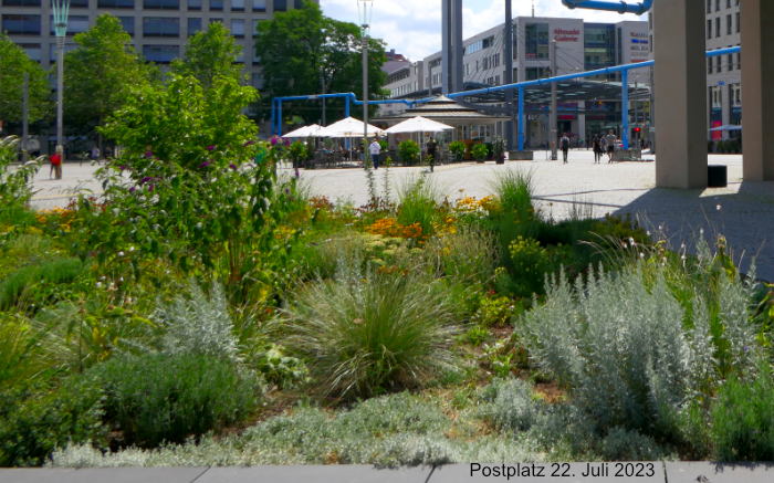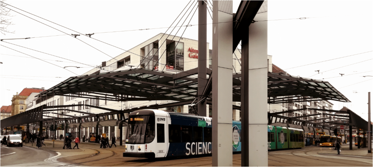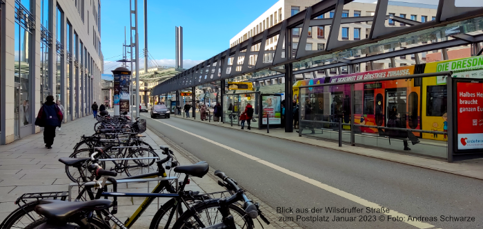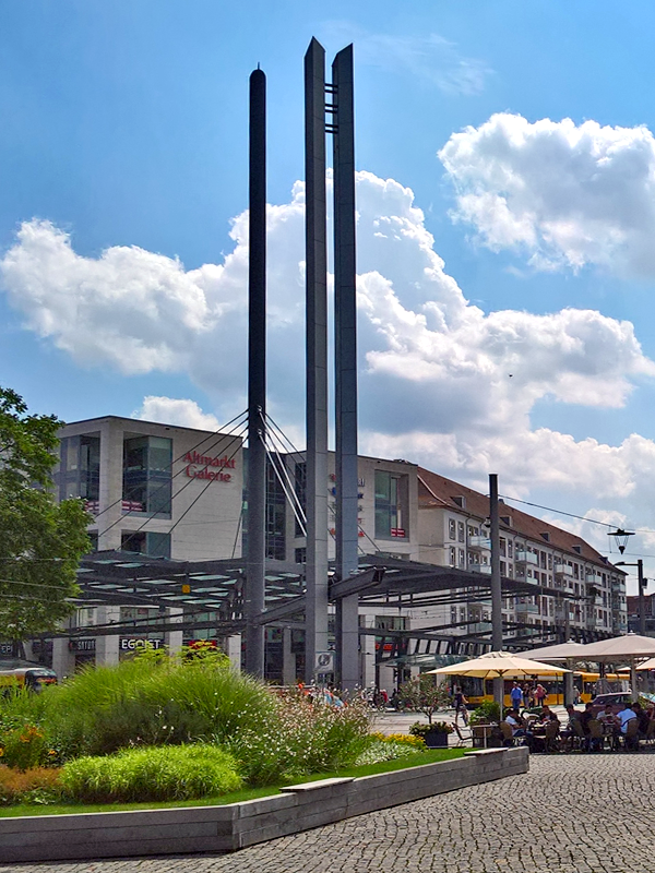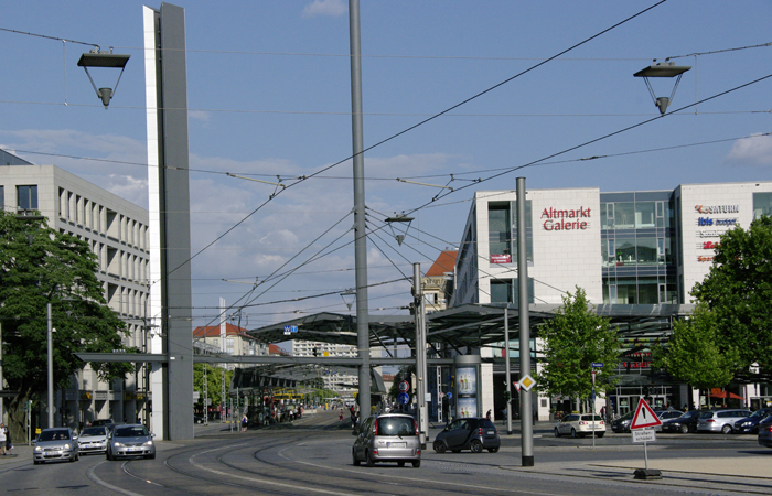 So, wie dem Postplatz längst seine Post abhandengekommen ist, ist auch seine Rolle als praktischer Verkehrsknotenpunkt der kurzen Wege nur noch Erinnerung. Die Haltestellen von Bahn und Bus wurden vom Platz weit in die Wilsdruffer und in die Wallstraße hinein verlegt, das Umsteigen fördert den Volkssport. Direkt gegenüber dem filigranen Zwinger-Ensemble wurde dafür eine monströse stählerne Haltestelle errichtet, deren großzügig ausufernde Konstruktion die Straßen wie ein Industriedenkmal überwuchert und angeblich einen Schmetterling symbolisieren soll.