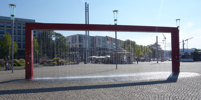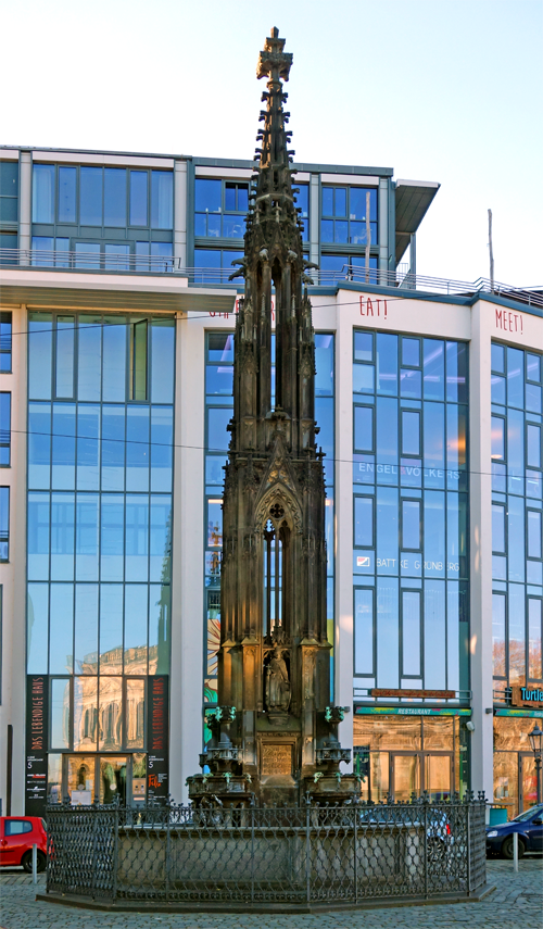 Den Übergang von der innovativen Architektur unserer Zeit in das Touristen-Mekka des historischen Schlossbezirks schmückt der neugotische Cholera-Brunnen von 1846. Er stand ursprünglich an der Stelle der Käseglocke und wurde 1927 hierher versetzt.