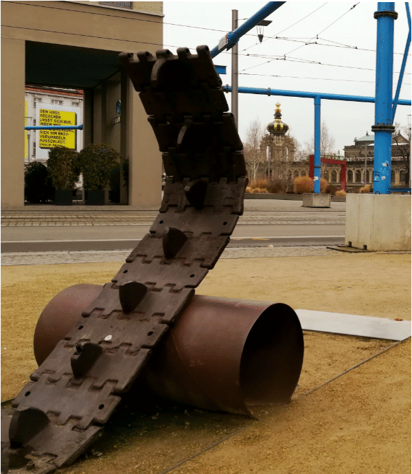 An der Ecke zur Freiberger Straße reckte sich seit 2008 trotzig-verlegen ein Stück Panzerkette eines russischen T34 in Richtung Kronentor, um heutige Generationen an die Ereignisse vom 17. Juni 1953 zu erinnern, als hier und auf dem Theaterplatz Demonstrationen stattfanden. Inzwischen ist das Kunstwerk im Zuge der Neubauten auf dem Gelände der alten Postgeäude etwas weiter nach hinten gerückt worden. Der vielen Toten, welche während der Maikämpfe 1849 und während des Kapp-Putsches 1920 diesen Platz mit ihrem Blut tränkten, wird leider nicht gedacht.