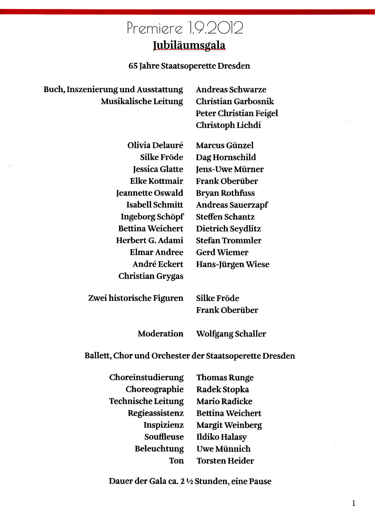 Im Jahr 2012 schrieb ich im Auftrag der Staatsoperette Dresden eine Revue zum 65. Jubiläum des Theaters. Ein heiteres Erzählerpaar begibt sich in mehreren Dialogszenen zwischen den Showblocks auf Zeitreise. Augenzwinkernd wird an Begebenheiten und Personen aus der bewegten Geschichte des Interimstheaters in Dresden-Leuben erinnert, die besonders dem treuen Dresdner Stammpublikum noch nah und vertraut sind. Der schwere Anfang 1945, die wilden fünfziger und sechziger Jahre, die Wende 1989 und der ewige Kampf um den Theaterneubau im Dresdner Zentrum werden thematisiert und vom gesamten Ensemble mit den großen musikalischen Glanzlichtern des heiteren Dresdner Volkstheaters zu einer lebensfrohen und zukunftsweisenden Revue verbunden.