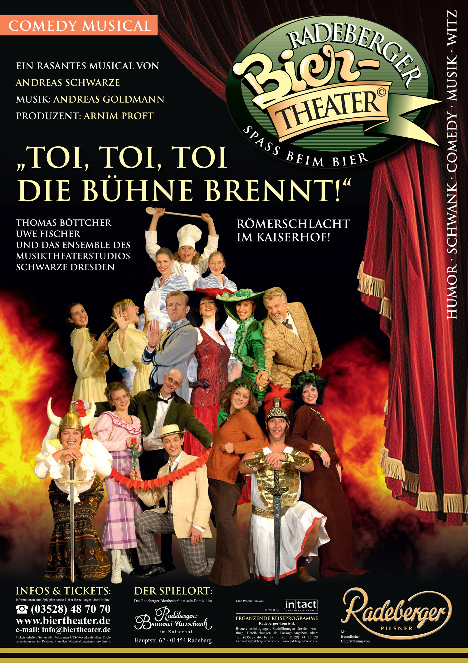 Gemeinsam mit dem bekannten Dresdner Musiker,Komponisten und Produzenten Andreas Goldmann brachte ich 2008 das Musical "Toi, toi, toi - die Bühne brennt!" auf die Bretter des Radeberger Biertheaters. Ich schrieb das Buch und die Songtexte, entwarf Bühne und Ausstattung und inszenierte den Theaterspaß mit einem enthusiastischen Ensemble aus Laien und Profis. Uwe Hähnel baute die stimmungsvollen Kulissen und die fleißigen Frauen von Loeser.net Freital nähten die zauberhaften Kostüme. Meine Frau Constanze übernahm nicht nur die Produktionsassistenz, sondern fungierte als erfinderische Maskenbildnerin, kümmerte sich um die Kostüme und spielte selbst mit - so brachten wir als Reinkarnation des legendären Komödiantenehepaars Striese dieses neue Striese-Stück heraus. In den Hauptrollen agierten neben den Moderatoren Thomas Böttcher und Uwe Fischer die Sopranistin Barbara Freitag, Margarethe Leopold, Conny Wilhayn, Martina Heger, Manja Ilgen, Heiko Dietrich, Reinhart Gröschel, Jens-Uwe Mürner, Thomas Rauch und das Ensemble meines Musiktheaterstudios Dresden.