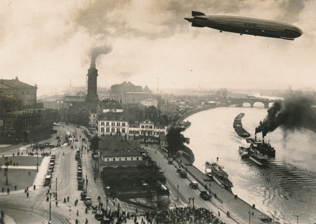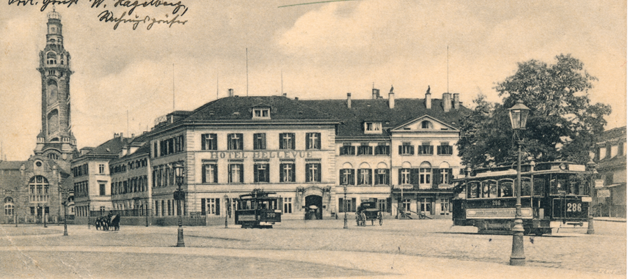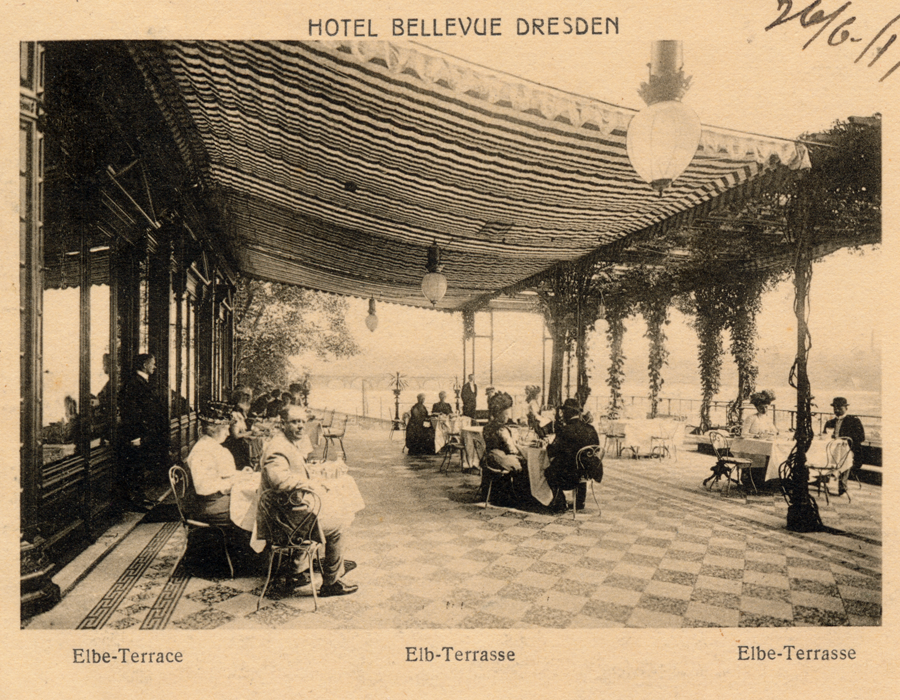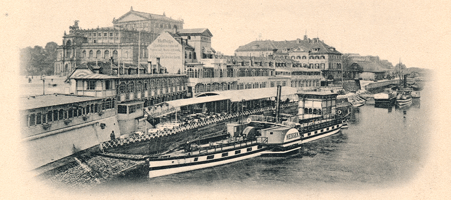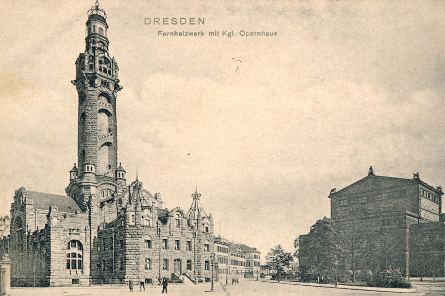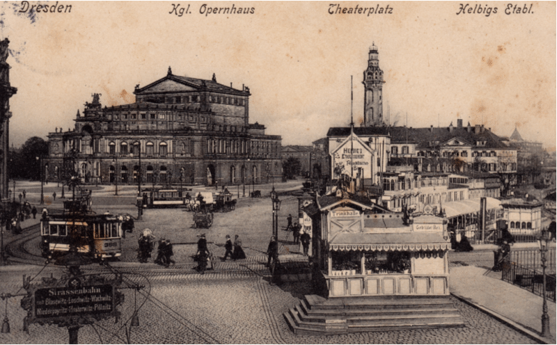 Rechts vom Opernhaus befand sich in den ehemaligen Gebäuden der Zuckersiederei des Dresdner Unternehmers und Kunstmäzens Calberla ab 1853 das noble Hotel Bellevue. Seine Ruine wurde 1950 abgerissen. Das der Stadt dahinter an dieser exponierten Stelle in der Elbsilhouette von der Staatsregierung 1899 aufgezwungene zentrale Heiz- und Elektrizitätskraftwerk für Schloss, Museen, Oper, Hofkirche und Landtag ist 1978 von der Bildfläche verschwunden.Ein Bild von 1929 zeigt, dass dessen von Architekt William Lossow so schön gestalteter Schornstein auch nur eine richtige Dreckschleuder war. Wie die hunderten Essen von Wohnhäusern, Fabriken, Lokomotiven und Schiffen, deren Qualm Dresdens Luft oft undurchdringlich machte. Aus der Gaststätte „Helbigs Etablissement“ wurde das „Italienische Dörfchen“.